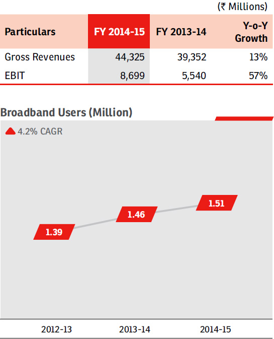 As on March 31, 2015, the Company had 226 Mn GSM customers. The Company’s customer acquisition and retention strategy is consistently yielding positive results in terms of reduced customer churn, from 2.9% last year to 2.7% in the current year. Data revenues, as a percentage to total revenues, increased from 9.9% to 15.2% in the current year. Of its total number of mobile subscribers, the Company had 46.4 Mn data customers (on the basis of the revised definition of ‘data customer’ as one who uses at least 1 MB per month) as on March 31, 2015, of which 19.4 Mn were subscribed to 3G data services.