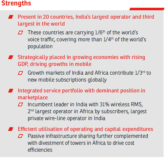 Our endeavour is to maintain the optimum capital structure at all times and maintain and solidify our balance sheet’s strength. Despite being at very comfortable levels of leverage, deleveraging remains on track following initiatives, such as equity infusion, value unlocking through our investee companies and cash-generation through hiving off of our African tower infrastructure assets. The investment grade ratings awarded and reaffirmed by international credit rating agencies reflect the inherent strengths of our business model, its robustness and scalability. We continue to be committed to creating value for all stakeholders, while ensuring highest standards of corporate governance.