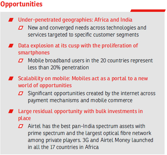 With strong linkages across all sectors, telecom has a key role to play in India's socio economic development. Data presents a key opportunity for the Company, going forward and increasing data network rollouts and investments by operators, including us, will drive not only connectivity, but also higher end application usage. Bharti Airtel continues to make significant investments in key assets to be able to drive this growth, such as spectrum and licenses, 3G and 4G networks, brand, IT and Customer care. Airtel is the only pan-India data operator in the country. Moreover, our presence in Africa and South Asia further strengthen our global leadership position and continue to enhance the respect your Company commands.