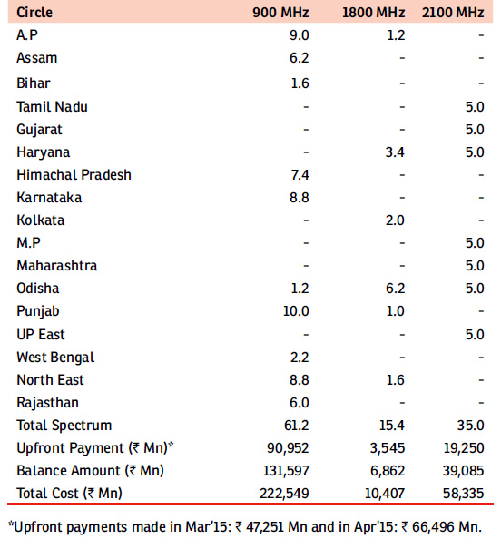 Since 2010, in five separate auctions, the Company has acquired spectrum valued at ` 681 Bn. This is in line with its long-term strategy to grow the internet user base, and emerge as a leading player in realising the national vision of a ‘Digital India’. The Company has secured its future and the roadmap for the next 20 years is now clear. The Company is committed to provide world-class voice and data services to its customers across 2G, 3G and 4G technologies.