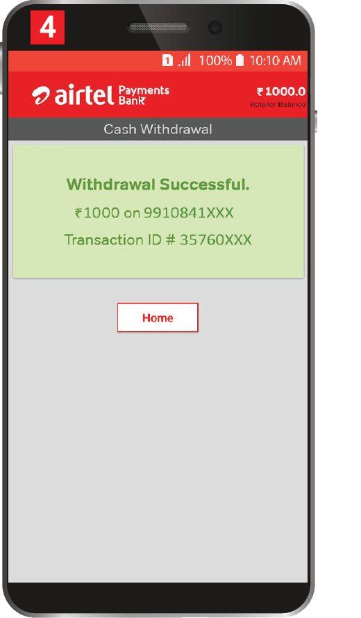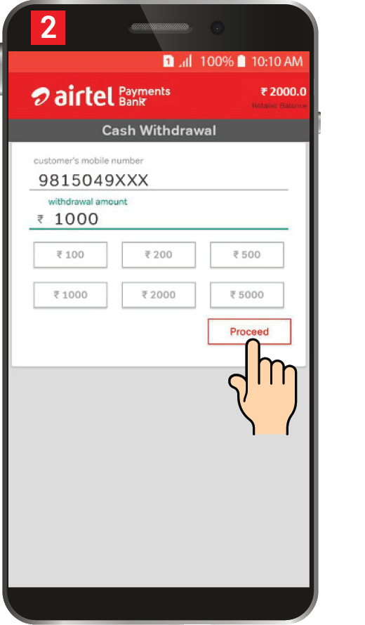 Enter Customer’s Account Linked Mobile number and deposit amount. Tap on Proceed ग्राहक के खाते से लिंक्ड मोबाइल नंबर और निकासी राशि दर्ज करें। Proceed पर Tap करें|