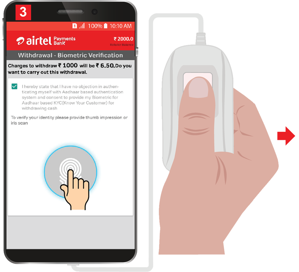 Tap on Finger Scan icon and Scan Customer’s Finger on Biometric Device. फिंगर स्कैन आइकॉन पर Tap करें और बायोमेट्रिक डिवाइस पर ग्राहक का फिंगर स्कैन करें।
