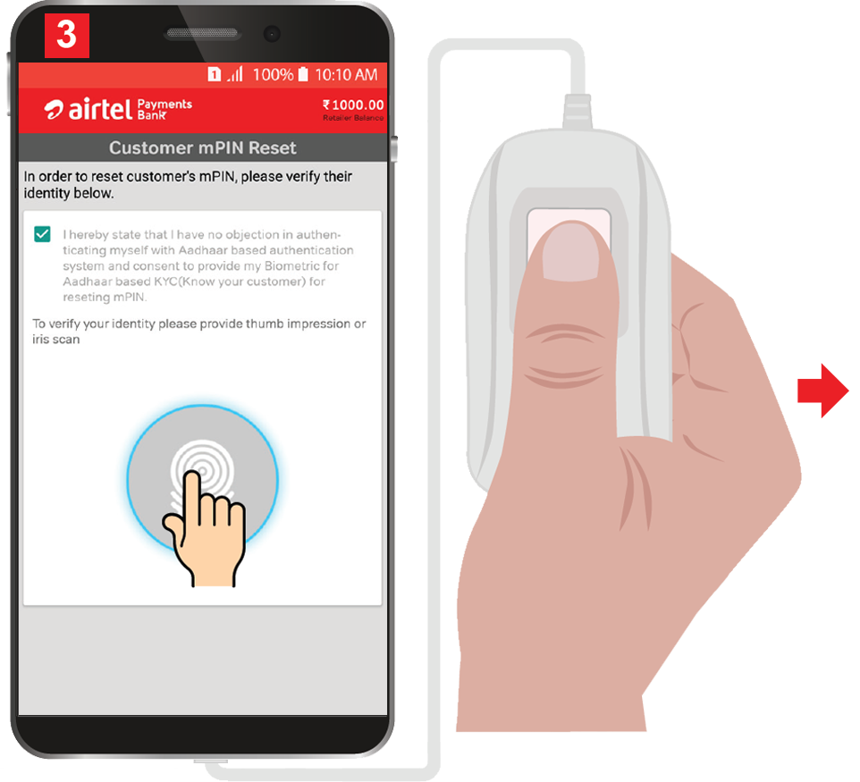 बायोमेट्रिक डिवाइस पर ग्राहक की फिंगर स्कैन करें।