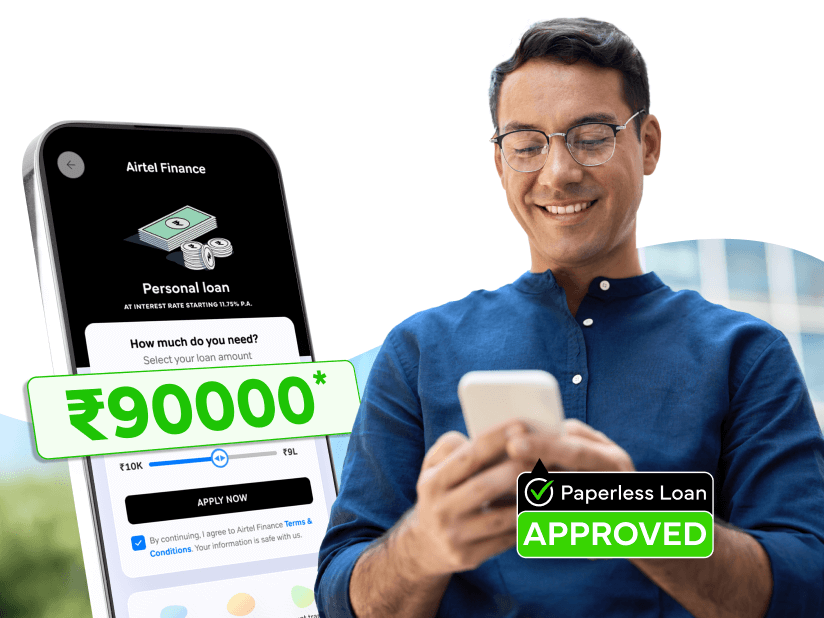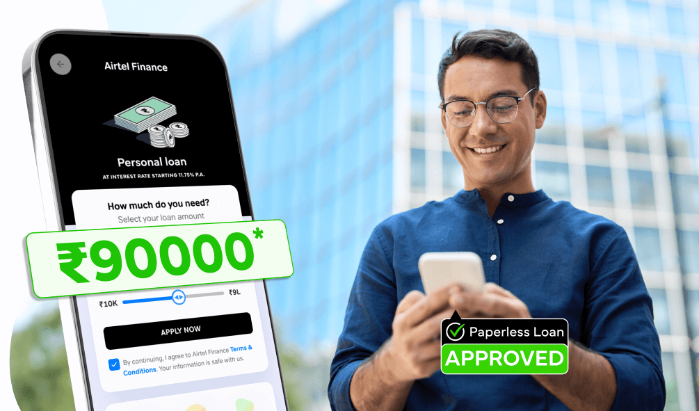 Easily avail an Airtel Finance Personal Loan of ₹90,000 online. Enjoy a quick, hassle-free application process and instant disbursal. This flexible loan is perfect for covering personal needs like urgent expenses, small purchases, or any other immediate financial requirements.